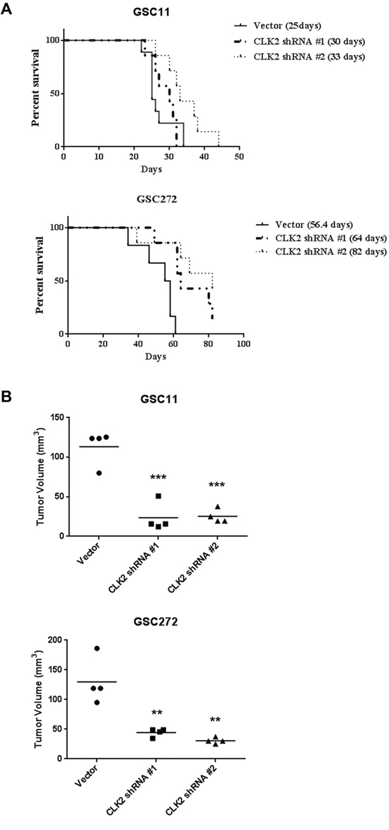 We performed orthotopic mouse xenograft experiments to determine the effect of CLK2 expression on glioblastoma progression in vivo. We injected CLK2-knockdown GSC11 and GSC272 cells into the brains of nude mice. We found that the median survival durations were 82.0, 64.0, and 56.4 days in mice injected with shRNA2-infected cells, shRNA1-infected cells, and vector cells, respectively (Figure 4A). In the GSC11-injected mice, only injection of shRNA2-infected cells produced markedly longer survival durations than did injection of vector cells. As in our in vitro assay, construct of shRNA2 infected cells had a greater effect on survival curve than did shRNA1-infected cells in vivo study. Furthermore, the volumes of CLK2-deficient shRNA1- and shRNA2-infected tumors were much lower than those of control tumors in GSC11 and GSC272 mouse models (Figure 4B).
