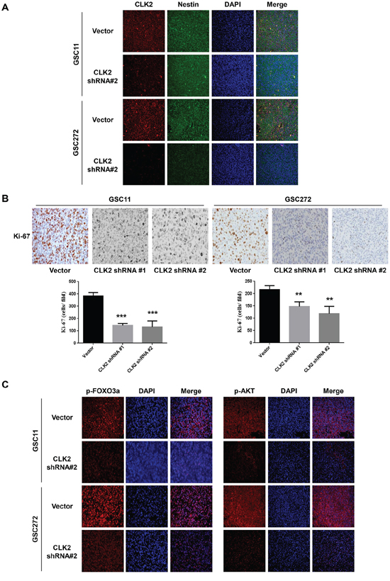 Figure 5: Depletion of CLK2 decreases the expression of Ki-67 and phosphorylation of AKT/FOXO3a. A-B. immunohistochemical stains of GSC11 and GSC272 tumor samples obtained from orthotopic murine xenografts. A, immunofluorescent stains for CLK2 and the stem cell marker nestin in GSC11 and GSC272 mouse xenografts with or without infection with CLK2 shRNA are shown. CLK2 was labeled as red and nestin as green. Expression of CLK2 and nestin overlap. B, Ki-67–positive cells stained brown with hematoxylin counterstain of nuclei. The bar graph shows the numbers of Ki-67–positive cells in vector-infected and CLK2-knockdown xenografts. C, immunofluorescent stains for phosphorylated AKT and FOXO3a in murine GSC11 and GSC272 cells. Phosphorylated AKT and FOXO3a stained red, and the nuclei were counterstained with 4',6-diamidino-2-phenylindole (blue).