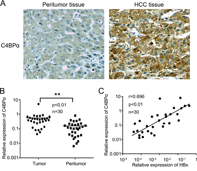 Figure 1: The expression levels of HBx are positively correlated with those of C4BPα in clinical HCC tissues. A. The expression levels of C4BPα were determined in the liver carcinoma and adjacent normal liver tissues by IHC analysis using tissue microarray. B. The relative mRNA expression levels of C4BPα were detected by qRT-PCR analysis in clinical liver carcinoma specimens and adjacent normal tissues (n = 30) (**p<0.01, Wilcoxon signed-rank test). C. The correlation of mRNA levels of C4BPα and HBx was examined by qRT-PCR assay in 30 pairs liver carcinoma tissues (p<0.01, r=0.696, Pearson’s correlation).