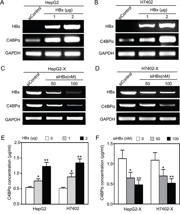 Figure 2: HBx up-regulates C4BPα in hepatoma cell. A, B. The mRNA levels of HBx and C4BPα were tested by RT-PCR analysis in HepG2 (or H7402) cells transiently transfected with pCDNA3.1-HBx. C, D. The expression levels of HBx and C4BPα were examined by RT-PCR analysis in HepG2-X cells (or H7402-X) treated with HBx siRNA. E. The protein levels of C4BP were examined by ELISA in the supernatant of HepG2 (or H7402) cells treated with pCDNA3.1-HBx. F. The protein levels of C4BP were examined by ELISA in the supernatant of HepG2-X (or H7402-X) cells treated with HBx siRNA. *p<0.05, **p<0.01, Student’s t-test. All experiments were performed at least three times.