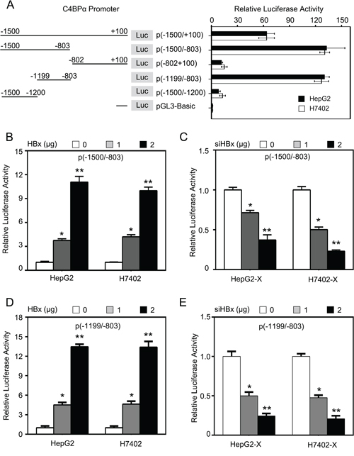 Figure 3: HBx is able to activate the core region -1199/-803nt in promoter of C4BPα. A. The relative activities of different regions of C4BPα promoter were examined by luciferase reporter gene assays in HepG2 (or H7402) cells. B. The relative activities of the core promoter (-1500/-803nt) of C4BPα were detected by luciferase reporter gene assays in HepG2 cells or H7402 cells transiently transfected with pCDNA3.1-HBx. C. The relative activities of the core promoter (-1500/-803nt) of C4BPα were detected by luciferase reporter gene assays in HepG2-X cells (or H7402-X) transiently transfected with HBx siRNA. D. The relative activities of the core promoter (-1199/-803nt) of C4BPα were detected by luciferase reporter gene assays in HepG2 cells or H7402 cells transiently transfected with pCDNA3.1-HBx. E. The relative activities of the core promoter (-1199/-803nt) of C4BPα were detected by luciferase reporter gene assays in HepG2-X cells (or H7402-X) transiently transfected with HBx siRNA. *p<0.05, **p<0.01, Student’s t-test. All experiments were performed at least three times.