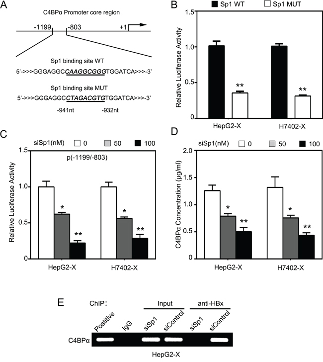 Figure 4: HBx activates C4BPα promoter through transcription factor Sp1. A. The illustration of the responsive region to HBx in C4BPα promoter was shown. B. The relative activities of the core promoter (-1199/-803nt) of C4BPα containing wild type (WT) or mutant type (MUT) of Sp1 binding site were detected by luciferase reporter gene assays in HepG2-X or (H7402-X) cells. C. The relative activities of the core promoter (-1199/-803nt) of C4BPα were detected by luciferase reporter gene assays in HepG2-X or (H7402-X) cells transiently transfected with Sp1 siRNA. D. The protein levels of C4BPα were examined by ELISA in the supernatant of HepG2-X (or H7402-X) cells treated with Sp1 siRNA. E. The interaction between HBx and Sp1 in HepG2-X cells was examined by ChIP assays. *p<0.05, **p<0.01, Student’s t-test. All experiments were performed at least three times.