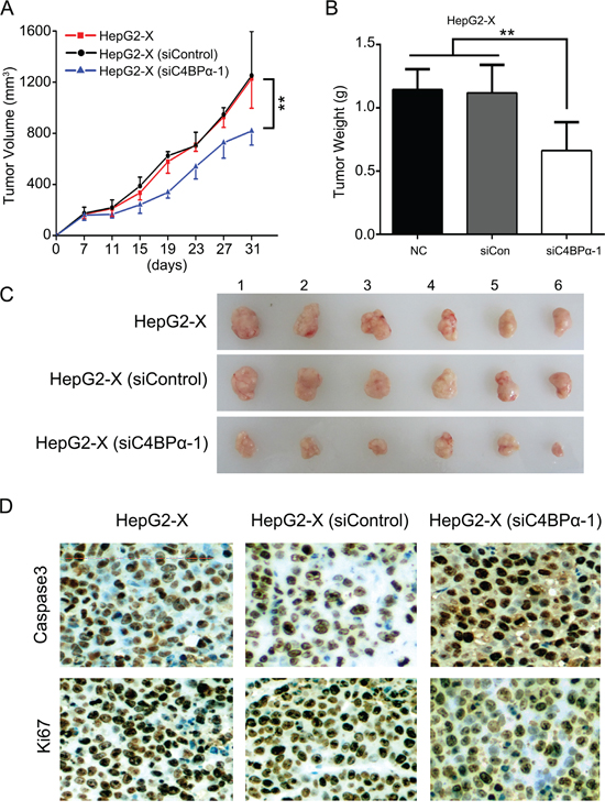 Figure 6: SiC4BPα results in suppression of growth of hepatoma cells through inducing sensitivity of hepatoma cells to CDC in vivo. A, B. HepG2-X cells treated with C4BPα siRNA were transplanted into the nude mice. The growth curve and average weight of tumors were shown. C. The image of dissected tumors from nude mice (n = 6). D. The expression of caspase3 and Ki67 was tested by IHC analysis in the tumor tissues from nude mice. *p<0.05, **p<0.01, Student’s t-test.