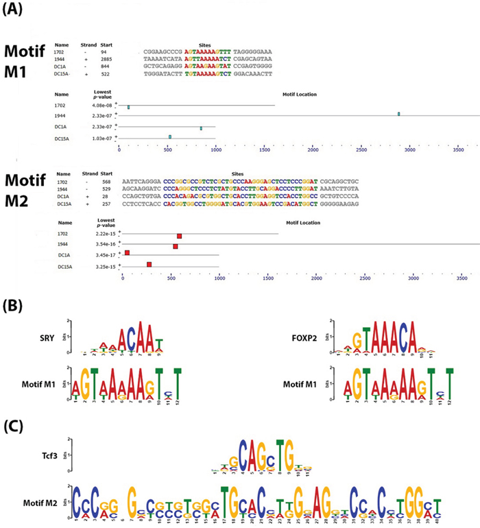 The DNA sequence for enhancers 1702 and 1944 along with DMRs, DC1A and DC15A, were entered into MEME (Multiple EM for Motif Elicitation) [68], a Web service available on MEME suite [69]. MEME can be used to discover motifs in a group of related nucleotide or peptide sequences. A MEME motif is a sequence pattern that occurs repeatedly in one or more sequences in the input group. MEME can be used to discover novel patterns because it bases its discoveries only on the input sequences and not on any prior knowledge (such as databases of known motifs). In this case, only motifs that were present in all 4 DNA sequences were taken for further analysis in TOMTOM [70]. TOMTOM was used to search against the JASPAR CORE collection of vertebrate TFBS motifs [71] for similarities of the motifs identified by MEME, M1 and M2, to known TFBSs.