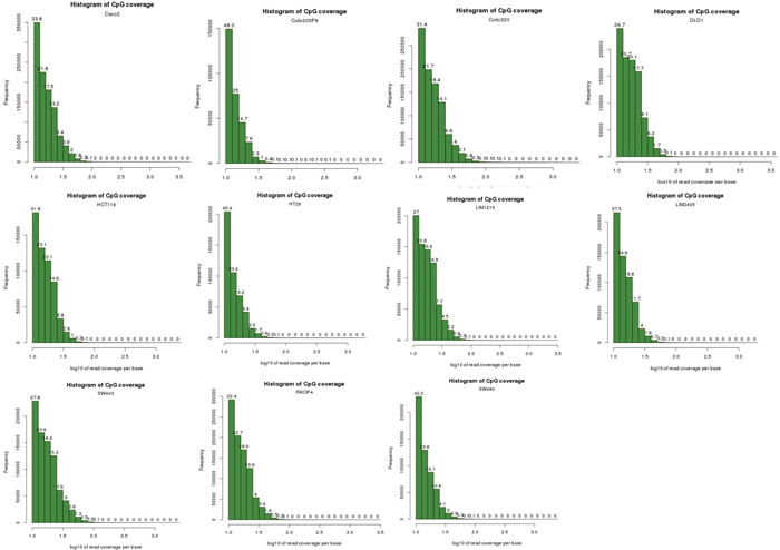 Figure 3: Histogram plots of read coverage per base for the 11 cell lines. These histogram plots show that the NGS data for the 11 cell lines do not suffer from PCR amplification bias. Experiments that suffer from PCR duplication bias will have a secondary peak on the right-hand side of the histogram. As no secondary peak is observed in our data for all 11 cell lines, this indicates that our data do not suffer from PCR duplication bias.