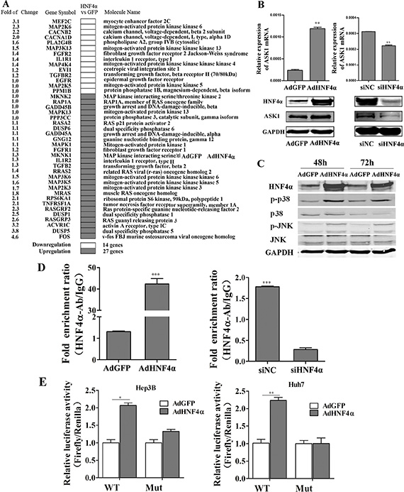 Figure 1: HNF4α regulates the MAPK signaling pathway and activates ASK1 by binding to its promoter. (A) cDNA microarray analysis identified downregulated and upregulated MAPK signaling pathway genes in Hep3B cells infected with AdHNF4α or AdGFP after 72 h. (B) RT-PCR and Western blot analysis of ASK1 expression in AdHNF4α-infected or siHNF4α-transfected Hep3B cells after 72 h. (C) Western blot analysis of phospho-(p-)p38, p38, p-JNK, and JNK expression in AdHNF4α-infected Hep3B cells after 48 h and 72 h. (D) ChIP assays revealed HNF4α binding to ASK1 promoter region. RT-PCR was performed to examine DNA fragments immunoprecipitated by the anti-HNF4α antibody with primers targeting the HNF4α response element. DNA immunoprecipitated using normal rabbit IgG (IgG) was used as the control. (E) Luciferase activity in HCC cells for a reporter plasmid harboring the HNF4α response element derived from the ASK1 promoter. Mutation of the HNF4α response element (Mut) abolished HNF4α transcriptional activity. Each value represents the mean ± SD of triplicate experiments. Data represent the mean ± SD, *P < 0.05, **P < 0.01.