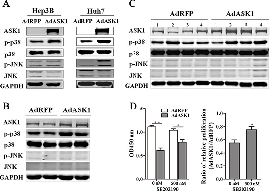 Figure 6: ASK1 overexpression increases p38 phosphorylation. (A) Western blot analysis of ASK1, p-p38, p38, p-JNK, and JNK expression in AdASK1-infected Hep3B and Huh7 cells. (B) Western blot analysis of ASK1, p-p38, p38, p-JNK, and JNK expression in the Huh7 tumor nodules intratumorally injected with AdASK1 or AdRFP. (C) Western blot analysis of ASK1, p-p38, p38, p-JNK, and JNK expression in orthotopic HCC model mice systemically injected with AdASK1 or AdRFP. (D) Cell proliferation of Hep3B cells incubated with p38 inhibitor SB202190 after AdASK1 infected. Data represent the mean ± SD, *P < 0.05, **P < 0.01.