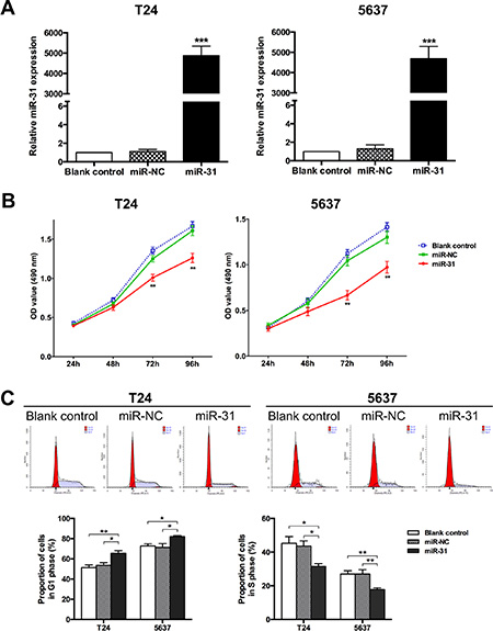 Figure 2: MiR-31 suppresses proliferation of UBC cells. (A) T24 and 5637 cells were transfected with miR-31 mimic (50 nM); cells without transfection and those transfected with miR-NC served as blank and negative control, respectively. Expression of miR-145 was detected by qRT-PCR at 48 h after transfection; U6 snRNA served as an internal control. (B) At indicated time points after seeding, MTT assays were performed to evaluate the proliferation capacities of UBC cells for all groups. (C) Representative pictures of cell cycle distribution as detected by FCM analysis (upper panel) and comparison of the relative numbers of G1 phase cells (lower left panel) or S phase cells (lower right panel) among groups. Data are presented as mean ± SEM. *P < 0.05; **P < 0.01; ***P < 0.001.