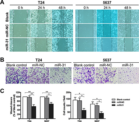 Figure 3: MiR-31 inhibits migration and invasion of UBC cells. (A) T24 and 5637 cells were either without transfection (blank control) or transfected with miR-NC or miR-31, and then subjected to wound healing assay to determine the migration capacity at 24 h and 48 h following scarification, respectively. (B) Transwell assay was performed to evaluate the invasion capacity of UBC cells at 24 h after seeded onto the upper chamber. (C) Measurement of wound closure based on initial and residual (48 h) gap lengths in wound healing assay (left panel, relative to blank control group), and quantification of invaded cells in transwell assay (right panel); data are presented as mean ± SEM; *P < 0.05; **P < 0.01.