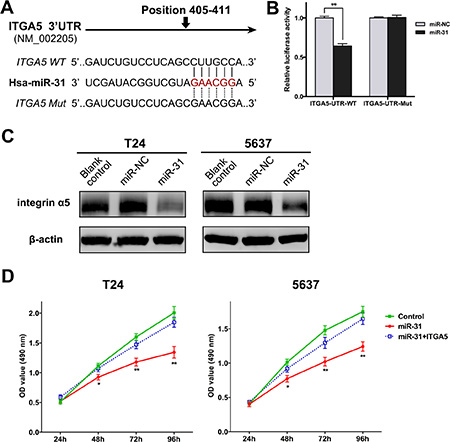 Figure 4: ITGA5 is a direct target of miR-31 in UBC cells. (A) The potential miR-31 binding sites of wild-type ITGA5 3′UTR and the mutated sequences. (B) The relative luciferase activity was detected in T24 cells co-transfected with miR-31 (or miR-NC) and reporter plasmid carrying wild-type or mutant ITGA5 3′UTR. (C) Western blot assay was performed to determine the expression of ITGA5 protein in T24 and 5637 cells either without transfection (blank control), or transfected with miR-NC or miR-31. (D) MTT assay was performed to compare proliferation of UBC cells after co-transfection of miR-31 (or miR-NC) and ITGA5-expressing plasmid (or empty plasmid); cells co-transfected with miR-NC and empty plasmid served as negative control. Data are presented as mean ± SEM; *P < 0.05; **P < 0.01.