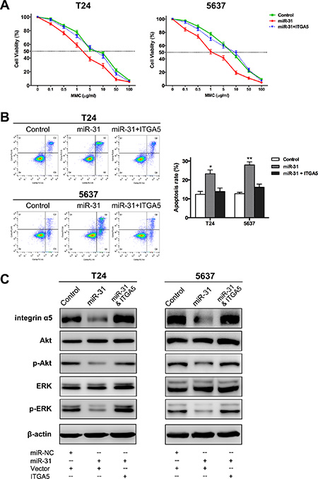 Figure 5: MiR-31/ITGA5 axis increases sensitivity of UBC cells to MMC via inactivating Akt and ERK pathways. (A) Following 24 h treatment with MMC at different concentrations, MTT assay showed the survival rates of UBC cells co-transfected with miR-31 and empty plasmid were remarkably lower than those of cells co-transfected with miR-NC and empty plasmid (control); while co-transfection of miR-31 and ITGA5-expressing plasmid abrogated this effect. (B) Representative pictures of cell apoptosis distribution as detected by FCM analysis; region Q1, Q2, Q3 and Q4 shows dead, late apoptotic, early apoptotic and living cells, respectively; Q2 and Q3 are collectively regarded as apoptotic cells (left panel). Co-transfection of ITGA5-expressing plasmid basically eliminated the significant aggravation of MMC-induced apoptosis arising from miR-31 expression (right panel). (C) As indicated by western blot assay, overexpression of miR-31 significantly reduced the protein levels of ITGA5, phospho-Akt and phospho-ERK, while both Akt and ERK were reactivated again after ITGA5 expression was restored. Data are presented as mean ± SEM; *P < 0.05; **P < 0.01.