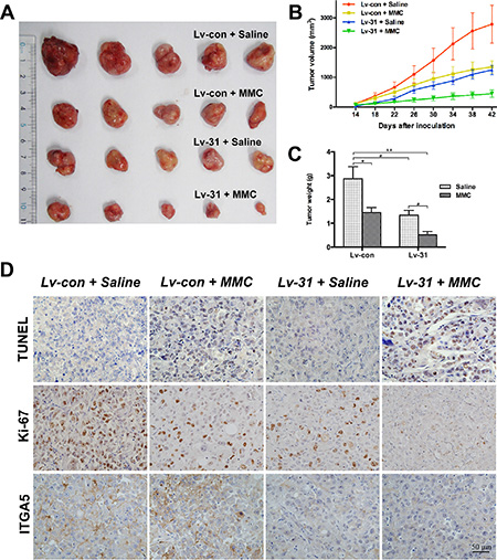 Figure 6: MiR-31 attenuates xenograft tumor growth and exhibits a synergistic effect with MMC treatment in vivo. (A) Representative photographs of dissected xenograft tumors from nude mice after sacrificed. (B and C) Graphics representing tumor volumes at indicated days after inoculation and tumor weights at the end of the experiment; data are presented as mean ± SEM; *P < 0.05; **P < 0.01. (D) Representative images from multiple fields of xenograft tumor sections with TUNEL, Ki-67 or ITGA5 staining; bars: 50 μm.