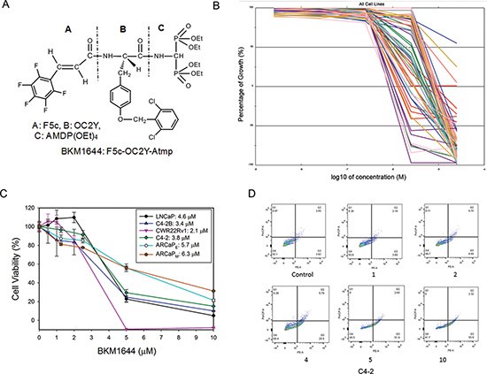 Figure 1: In vitro anti-cancer activities of BKM1644 in human cancer cell lines. (A) Chemical structure of BKM1644. (B) Dose response curves of BKM1644 in NCI60 panel. (C) In vitro cytotoxicity of BKM1644 in a panel of human PCa cell lines (72 h treatment). (D) Annexin V expression on C4-2 cells following BKM1644 treatment at the indicated concentrations (μM) (24 h).
