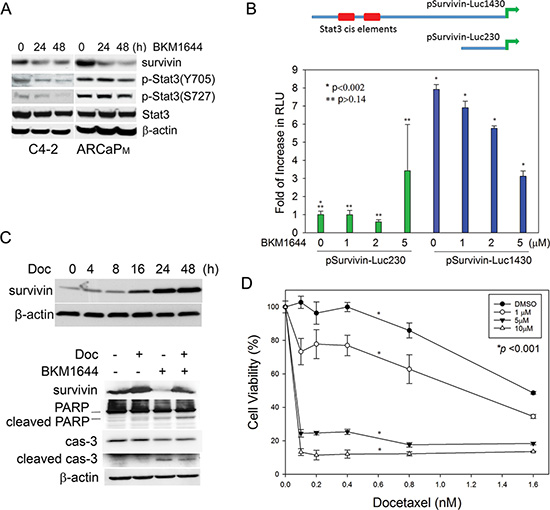 Figure 2: BKM1644 inhibits survivin expression through a Stat3-dependent mechanism. (A) BKM1644 (5 μM) inhibits survivin proteins and the phosphorylation of Stat3 at Ser727 and Tyr705 residues in Western blot analysis. (B) Top panel: human survivin promoter contains two putative Stat3 binding elements; Bottom panel: BKM1644 selectively inhibits the luciferase activity of pSurvivin-Luc1430 in a dose-dependent manner. The reporters were transfected into C4-2 cells for 24 h prior to further treatment with BKM1644 for 48 h. (C) Top panel: Docetaxel treatment (2.5 nM) increases survivin protein expression in a time-dependent manner in C4-2 cells; Bottom panel: BKM1644 (5 μM) antagonizes survivin induction by docetaxel (2 nM) and activates apoptosis in C4-2 cells during a 24-h culture. (D) BKM1644 sensitizes C4-2 cells to docetaxel treatment in a dose-dependent manner (72 h).