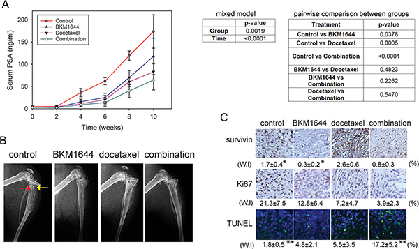 Figure 3: BKM1644 inhibits C4-2 tumor growth in mouse skeletons and enhances the in vivo efficacy of docetaxel. (A) Left panel: BKM1644 alone or combined with docetaxel significantly reduces serum PSA levels in athymic nude mice bearing C4-2 tumors; Right panel: statistical analysis on the in vivo effect of BKM1644. (B) BKM1644 treatment improves the bone architecture in C4-2 tumor-bearing mice. Red arrow: osteoblastic lesion; yellow arrow: osteolytic lesion. (C) BKM1644 inhibits the in vivo expression of survivin and Ki67, and induces apoptosis in C4-2 skeletal tumor, as demonstrated by IHC and TUNEL assays. Two-tailed t-test was used to calculate p values on the weighted index (W.I). *, ** indicate p-values < 0.05.