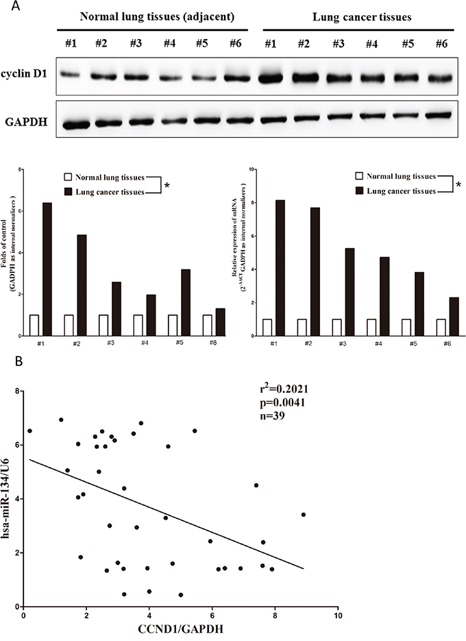 Figure 2: Expression of CCND1 is up-regulated in primary human lung cancer and negatively expressed related to miR-134. A. Western-blot of cyclin D1 protein and qRT-PCR of CCND1 mRNA in lung cancer tissues and adjacent-normal lung cancers. n=39 for each group. B. Scatter plots showing the inverse association between miR-134 level and CCND1 mRNA expression. *P < 0.001, Means ± SEM was shown. Statistical analysis was conducted using student t-test.