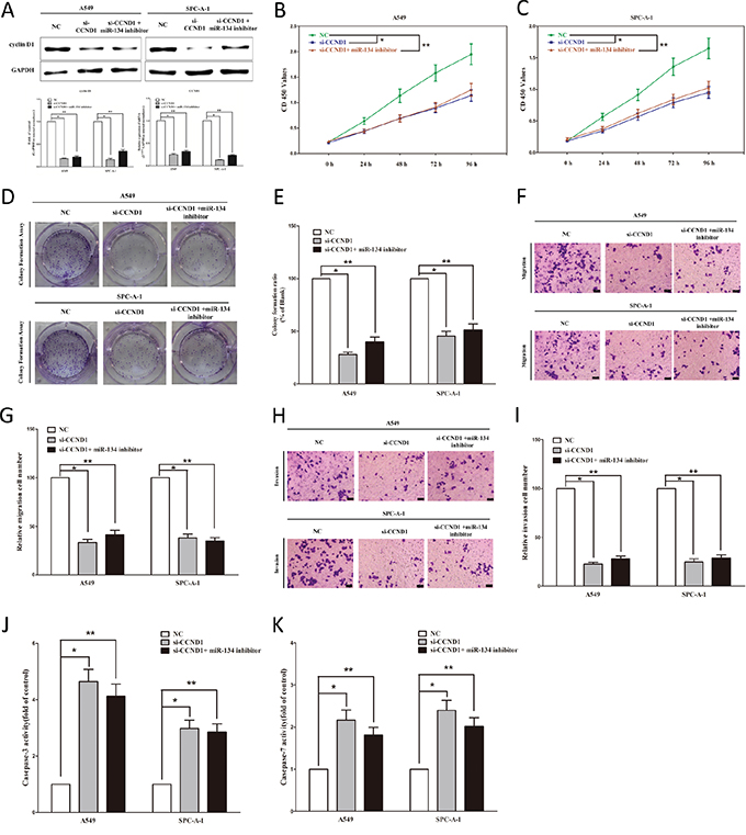 Figure 4: Inhibition of miR-134 does not reverse the anticancer efficacy of silence of CCND1 expression in vitro. A. Western-blot of cyclin D1 protein and qRT-PCR of CCND1 mRNA in si-CCND1 treated and blank A549 and SPC-A-1 cells, and si-CCND1 + miR-134 inhibitor. B-C. CCK8 assays of A549 and SPC-A-1 cells after transfected (un-transfected) with si-CCND1 and si-CCND1 + miR-134 inhibitor. D-E. Shown are representative photomicrographs of colony formation assay after transfected with (without) si-CCND1 and si-CCND1 + miR-134 inhibitor for fourteen days. F-G. Shown are representative photomicrographs of transwell migration assay after transfected with (without) si-CCND1 and si-CCND1 + miR-134 inhibitor. H-I. Shown are representative photomicrographs of transwell invasion assay after transfected with (without) si-CCND1 and si-CCND1 + miR-134 inhibitor. G-K. Quantitative representation of caspase-3 and caspase-7 activity in A549 and SPC-A-1 cells transfected with (without) si-CCND1 and si-CCND1 + miR-134 inhibitor for forty eight hours. Assays were performed in triplicate. *P < 0.001, **P < 0.001, Means ± SEM was shown. Statistical analysis was conducted using ANOVA.