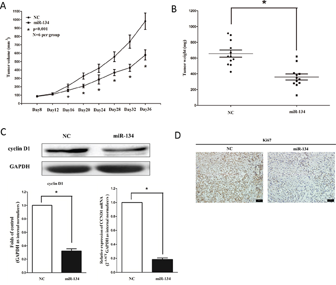 Figure 5: Ectopic expression of miR-134 suppresses tumor growth in vivo. A. Tumor volume in nude mice. B. Tumor weight in nude mice. Each group contained six mice (n = 6); the data are presented as the mean ± SEM; *p < 0.001, compared with the NC group. C. The expression of cyclin D1 protein and mRNA in nude mice. Assays were performed in triplicate. *P < 0.001, Means ± SEM are shown. Statistical analysis was conducted using student t-test. D. Immunohistochemistry showed miR-134 decreased the proliferation index Ki67.