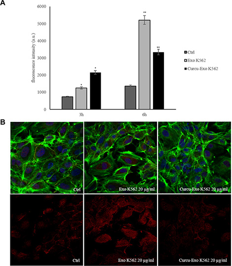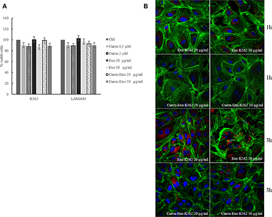 Figure 1: (A) HUVECs cell viability was measured by MTT assay after treatment with Curcu-Exo (20–50 μg/ml), Curcumin (0.5 and 2 μM) was used as negative control. The values were plotted as a percentage of viable cells. Each point represents the mean ± SD of three independent experiments. (B) Analysis at confocal microscopy of HUVECs treated, for 1 and 3 hours, with 20 μg/ml (Exo 20 μg/ml) and 50 μg/ml (Exo 50 μg/ml) of K562 exosomes, compared with HUVECs treated, for 1 and 3 hours, with 20 μg/ml (Curcu-Exo 20 μg/ml) and 50 μg/ml (Curcu-Exo 50 μg/ml) of exosomes released from K562 cells treated with 20 μM Curcumin. HUVECs were stained with ActinGreen (green), nuclear counterstaining was performed using Hoechst (blue); exosomes were labelled with PKH26 (red).