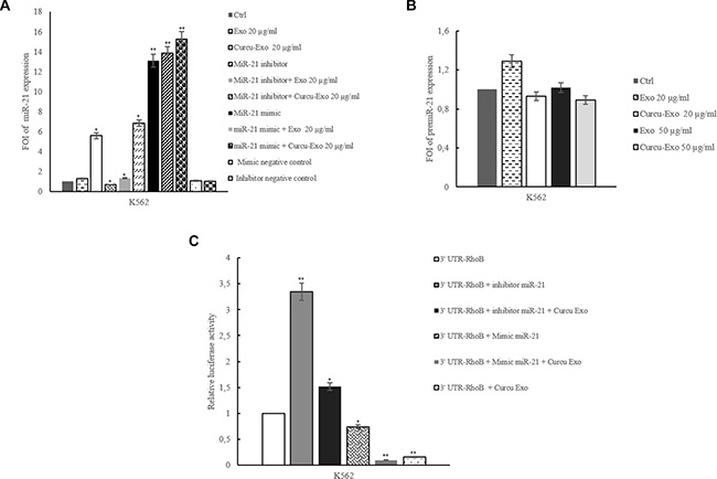 Figure 2: MiR-21 expression in HUVECs treated with exosomes released by K562 treated or not with Curcumin. (A) miR-21 expression levels in HUVECs treated with 20 μg/ml of K562 Curcu-exosomes and control exosomes were determined by quantitative Real time PCR analysis. We also analyzed miR-21 expression in HUVECs treated with K562 Curcu-exosomes and control exosomes and/or transfected with miR-21 inhibitor or miR-21 mimic. Values (FOI: fold of induction) are the mean ± SD of 3 independent experiments *p ≤ 0.05, **p ≤ 0.01. (B) Pre-miR-21 expression in HUVECs treated with different amounts of K562 exosomes. Pre-miR-126 expression levels in HUVECs treated with 20 and 50 μg/ml of K562 exosomes were determined by quantitative Real time PCR analysis. We also analyzed pre-miR-21 expression in HUVECs treated with K562 Curcu-exosomes and control exosomes and/or transfected with miR-21 inhibitor or miR-21 mimic. (C) Luciferase activity of HUVECs transfected with reporter plasmid (RhoB-pEZX), treated with K562 Curcu-exosomes and control exosomes and/or cotransfected with miR-21 inhibitor or miR-21 mimic.