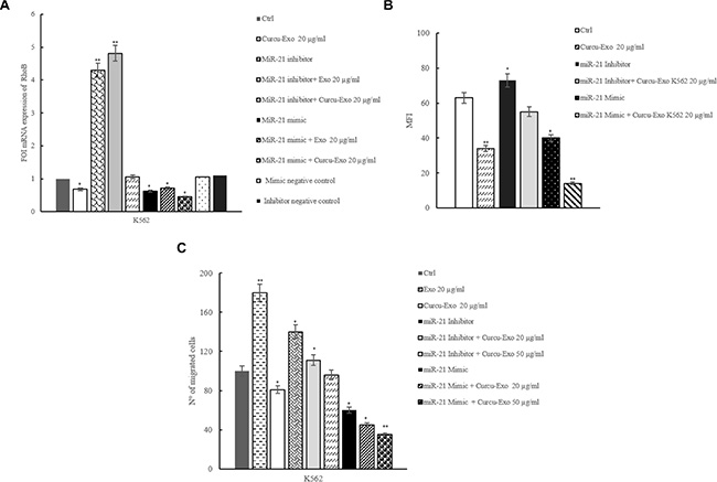 Figure 3: MiR-21, shuttled by exosomes, modulates RhoB expression in HUVECs. (A) Real time PCR analysis showed that RhoB mRNA expression decreased in HUVECs treated with Curcu-exosomes compared to control exosomes. Expression of RhoB was evaluated in HUVECs transfected with 2-Ome-miR-21 (miR-21 inhibitor) treated or not with 20 μg/ml of control exosomes (miR-21 inhibitor + Exo 20 μg/ml) and Curcu-exosomes (miR-21 inhibitor + Curcu-Exo 20 μg/ml). Expression of RhoB was also evaluated in HUVECs transfected with miR-21 mimic (miR-21 mimic) treated or not with 20 μg/ml of control exosomes (miR-21 mimic + Exo 20 μg/ml) and Curcu-exosomes (miR-21 mimic + Curcu-Exo 20 μg/ml). Values (FOI: fold of induction) are the mean ± SD of 3 independent experiments *p ≤ 0.05, **p ≤ 0.01. (B) Histogram shows the MFI (Mean Fluorescence Intensity) relative to the expression of RhoB in HUVECs after treatment with low serum medium (Control), 20 μg/ml of exosomes (Exo 20 μg/ml) and 20 μg/ml of Curcu-exosomes (Curcu-exo 20 μg/ml). Expression of RhoB was evaluated, with FACS analysis, in HUVECs transfected with 2-Ome-miR-21(miR-21 inhibitor) and treated with 20 μg/ml of control exosomes (miR-21 inhibitor + Exo 20 μg/ml) and Curcu-exosomes (miR-21 inhibitor + Curcu-Exo 20 μg/ml). Surface expression of VCAM1 was evaluated in HUVECs transfected with miR-21 mimic (miR-21 mimic) and treated with 20 μg/ml of control exosomes (miR-21 mimic + Exo 20 μg/ml) and 20 μg/ml of Curcu-exosomes (miR-21 mimic + Curcu-Exo 20 μg/ml). Values are the mean ± SD of 3 independent experiments *p ≤ 0.05 **p ≤ 0.01. (C) Curcu-exosomes inhibit HUVECs migration. Addition of control exosomes (20, 50 μg/ml) to the upper wells of the chamber induces dose-dependent increase of HUVEC migration, the addition of Curcu-exosomes reverts this effects. Values are the mean ± SD of 3 fields in three independent experiments *p ≤ 0.05, **p ≤ 0.01. The ability of migrating of HUVECs transfected with 2-Ome-miR-21 (miR-21 inhibitor) treated or not with 20 μg/ml of control exosomes (miR-21 inhibitor + Exo 20 μg/ml) and with 20 μg/ml of Curcu-exosomes (miR-21 inhibitor + Curcu-Exo 20 μg/ml), was evaluated. The ability of migration of HUVECs transfected with miR-21 mimic (miR-21 mimic) treated or not with 20 μg/ml of control exosomes (miR-21 mimic + Exo 20 μg/ml) and with 20 μg/ml of Curcu-exosomes (miR-21 mimic + Curcu-Exo 20 μg/ml) was also measured.