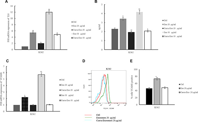 Figure 4: Treatment of HUVECs with Curcu-exosomes modulated IL8 and VCAM1 expression. (A) Real time PCR analysis showed that IL8 mRNA expression decreased in dose dependent manner in EC treated Curcu-exosomes compared to control exosomes. Values (FOI: fold of induction) are the mean ± SD of 3 independent experiments *p ≤ 0.05, **p ≤ 0.01. (B) ELISA assay showed that IL8 protein expression decreased in EC treated with Curcu-exosomes respect to control exosomes, in a dose dependent manner. (C) Real time PCR analysis showed that VCAM1 mRNA expression decreased in dose dependent manner in HUVECs treated with Curcu-exosomes compared to control exosomes. Values (FOI: fold of induction) are the mean ± SD of 3 independent experiments *p ≤ 0.05, **p ≤ 0.01. (D) FACS analysis showed that VCAM1 protein expression decreased in EC treated with Curcu-exosomes respect to control exosomes. e: Histogram shows the percentage of VCAM1 positive HUVECs after 6 hours of treatment with low serum medium (Ctrl), 20 μg/ml of exosomes (Exo 20 μg/ml) and 20 μg/ml of Curcu-exosomes (Curcu-exo 20 μg/ml). Values are the mean ± SD of 3 fields in three independent experiments *p ≤ 0.05, **p ≤ 0.01.