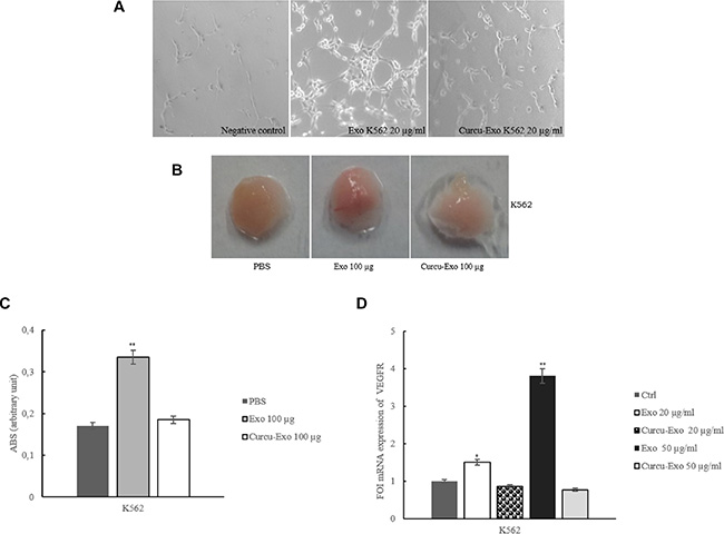 Figure 5: K562 exosomes stimulate in vitro and in vivo angiogenesis. (A) Phase contrast micrographs showing that K562 control exosomes induce an endothelial network formation on Matrigel, K562 Curcu-exosomes revert this effect. No tube formation is observed when HUVECs are plated in low-serum medium (negative control). (B) Matrigel plug containing K562 exosomes stimulate angiogenesis in mice (Exo 100 μg), this effect revert when K562 Curcu-exosomes (Curcu-Exo 100 μg) are used. PBS was used as a negative control. (C) Haemoglobin concentration in the exosomes-containing Matrigel was evaluated with Dabkin’s assay. (D) Real time PCR analysis showed that VEGFR mRNA expression decreased in EC treated with Curcu-exosomes compared to control exosomes. Values (FOI: fold of induction) are the mean ± SD of 3 independent experiments *p ≤ 0.05, **p ≤ 0.01.