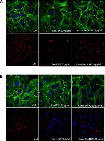 Figure 6: Alteration of HUVEC monolayer after addition of K562 exosomes. (A) Analysis at confocal microscopy of ZO-1 localization in HUVECs treated with K562 exosomes (Exo K562 20 μg/ml) revealed a decrease of immunostaining compared to untreated cells (Ctrl). The treatment with K562 Curcu-exosomes (Curcu-Exo K562, 20 μg/ml) reverted this effect. (B) Analysis at confocal microscopy of VE Cadherin localization in HUVECs treated with K562 exosomes (Exo K562 20 μg/ml) revealed a decrease of immunostaining compared to untreated cells (Ctrl). The treatment with K562 Curcu-exosomes reverted this effect (Curcu-Exo K562 20 μg/ml).