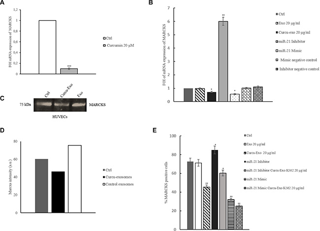 Tumor cell-derived exosomes can modulate target cells phenotype through the deliver of both RNAs and cargo proteins. To better investigate how exosome proteins from curcumin-treated K562 cells can mediate the anti-angiogenic effect observed on HUVECs, a proteomic analysis using a SWATH-MS approach was performed (for Materials and Methods see online Supplementary Information), on exosomes released by K562 cells treated or not with Curcumin. SWATH analysis is a quantitative label-free method that combines the high specificity of Data Independent Acquisition (DIA) method with a targeted data extraction strategy. Only proteins with a p ≤ 0.05 and a log10 fold-change > 0.2 or < −0.2 (for upregulated and downregulated proteins respectively) were considered for further analysis. A total of 30 proteins, differentially regulated in exosomes released by K562 cells following treatment with curcumin, were identified; in comparison with exosomes secreted by K562 control cells, Curcu-exosomes showed 4 up-regulated and 26 down-regulated proteins (Supplementary Tables S1 and S2). A GO enrichment analysis on all differentially expressed proteins was performed using iPathway Guide (http://www.advaitabio.com/ipathwayguide.html) highlighting a significant enrichment for those GO terms linked with biosynthetic processes and translation. In particular, the following GO terms resulted significantly enriched: intracellular transport (p-value = 0.008; BP), translation (p-value = 0.009; BP), cellular biosynthetic process (p-value = 0.0018; BP), nucleic acid binding (p-value = 0.016; MF), anion transmembrane transporter activity (p-value = 0.016; MF), nitric-oxide synthase regulator activity (p-value = 0.028; MF), structural constituent of ribosome (p-value = 0.033; MF), ribonucleoprotein complex (p-value = 0.013; CC), nucleus (p-value = 0.014; CC), ribosomal subunit (p-value = 0.015; CC.). Among them, nitric-oxide synthase regulator activity, referred to hsp90aa1 and hsp90ab1 proteins, is particularly interesting, since the nitric oxide (NO) pathway appears to play a key role in tumor angiogenesis and spread. Heat shock protein 90 (HSP90) binds directly to endothelial NO synthase (eNOS), promoting its activity and augmenting NO production [14]. Surprisingly, an accurate MEDLINE search allowed us to discover that approximately 50% of modulated protein dataset was involved with the angiogenic, invasive and metastatic processes (Table 2). Among these proteins, we focused our attention on MARCKS-related protein (MARCKSL1) because it is the mainly down-regulated protein, with a 10.6-fold down-regulation. Interestingly, miR-21 has been shown to specifically target the mRNA of MARCKS. So, we decided to further investigate the role played by this protein in the anti-angiogenic effect of curcumin.
