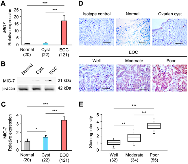 Figure 1: MIG-7 expression is elevated in EOC and correlates with advanced disease. A. qRT-PCR analysis of MIG7 transcriptional level in normal ovary, ovarian cyst and EOC tissues. The relative expression of the MIG7 gene is normalized to the expression of the ACTB (β-actin) gene. B, C. Western Blot and densitometric analyses of MIG-7 expression in normal ovary, ovarian cyst and EOC tissues. β-actin served as a loading control and was used for normalization. D. Representative IHC staining images of MIG-7 in normal ovary, ovarian cyst and EOC tissues at different FIGO stages. Bar: 100 μm. E. Statistical analysis of MIG-7 staining intensity in well, moderately and poorly differentiated EOC samples. The staining was scored by positivity and intensity. All data are presented as Mean ± SEM. The sample size of each group is indicated in the parentheses.*: p < 0.05; **: p < 0.01; ***: p < 0.001.