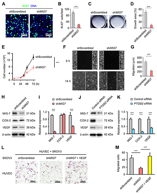 Figure 2: MIG-7 promotes EOC cell proliferation, invasion and angiogenesis in vitro. A, B. Immunofluorescent images and statistical analyses of Ki-67 expression in SKOV3 cells with control or MIG7 stable knockdown by scrambled or MIG7-targeting shRNA, respectively. Bar: 50 μm. C, D. Clonogenic assay of SKOV3 cells following control or MIG7 stable knockdown. E. Proliferation of SKOV3 cells with control or MIG7 stable knockdown in culture for 24, 36, 48 and 72 h. 1×104 cells were seeded at the beginning of the assay. F, G. Invasion of SKOV3 cells with control or MIG7 stable knockdown determined by a wound healing assay. White dashed lines indicate the gap of the cell monolayer at 0 and 14 after cell scratch. Bar: 200 mm. H, I. Western Blot and densitometric analyses of COX-2, MIG-7 and VEGFA expression in SKOV3 cells with control or MIG7 stable knockdown. β-actin served as a loading control. J, K. Western Blot and densitometric analyses of COX-2, MIG-7 and VEGFA expression in SKOV3 cells with control or PTGS2 (COX-2) knockdown by siRNA. β-actin served as a loading control. L, M. Hematoxylin staining and statistical analysis of HUVEC transmigration after 14 h of co-culture with SKOV3 cells with control or MIG7 stable knockdown with or without 100 ng/ml VEGFA. Each experiment was performed in triplicates. Data are presented as mean ± SEM of triplicates and represent 3 independent experiments. ***: p < 0.001.