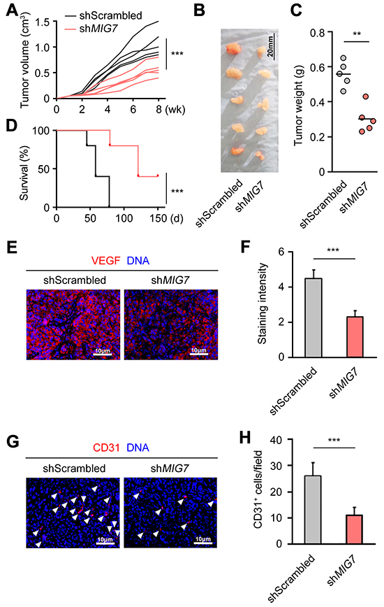 The expression of MIG-7 is very low or undetectable in normal non-cancerous tissues, but significantly increased in a variety of cancer tissues, such as breast, lung, colon and endometrial cancer [14]. Most studies on the function of MIG-7 on tumorigenesis were focused on tumor invasion and metastasis. Recently, several reports suggested a correlation between MIG-7 overexpression and metastasis of lung cancer, possibly via the activation of the COX-2-PDE2 pathway and the induction of E-cadherin suppressors to promote epithelial-mesenchymal transition [13, 22, 23]. However, the function of MIG-7 in the pathogenesis of EOC and its association with clinicopathological parameters and its prognosis were unknown. We showed elevated expression of MIG-7 in EOC tissues but not normal ovary or ovarian cyst, which supports MIG-7 as a biomarker for EOC progression. MIG-7 expression negatively correlated with histopathological differentiation and lymph node metastasis, and positively correlated with FIGO stage, indicating that MIG-7 predicts poor prognosis of EOC. In addition, MIG-7 was important in promoting EOC pathogenesis. Knocking down MIG7 impaired the proliferation, invasiveness and VEGFA expression of SKOV3 cells, and retarded tumor growth, reduced the formation of tumor-associated blood vessels in vivo and improved host survival after these cells were grafted. These functions of MIG-7 may underlie our clinical observation of the strong association between high MIG-7 expression and lymph node metastasis, poor histopathological differentiation of tumors and reduced survival of EOC patients.