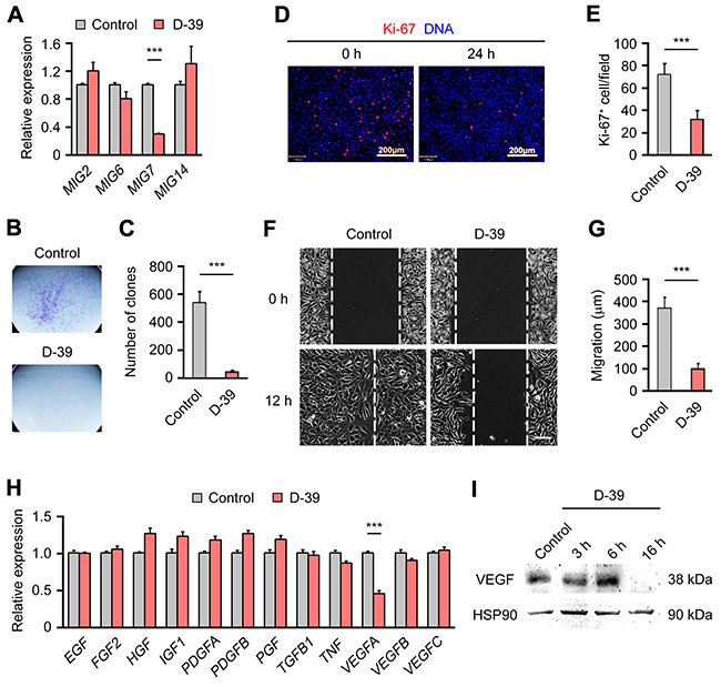 The potential therapeutic efficacy of inhibiting MIG-7 in EOC is further corroborated by the ability of the small molecule inhibitor D-39 from the medicinal plant L. muscari (Decne.) Baily to suppress the growth, migration and VEGFA expression of SKOV3 cells. Of note, D-39 exhibited specific inhibition of the expression of MIG-7 but not other MIG family members and selective killing of MIG-7-expressing SKOV3 cells. The specificity of D-39 on suppressing VEGFA over a variety of other angiogenic and growth factors echoed the requirement for MIG-7 in maintaining VEGFA expression. The mechanism underlying such potent and specific inhibition of MIG-7 expression by D-39 is under investigation.