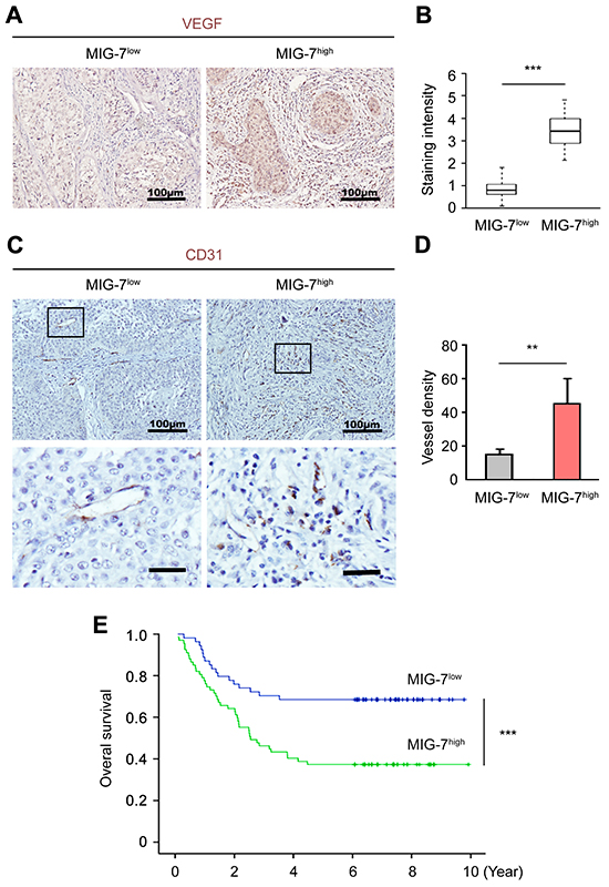 Migration-Inducting Gene 7 (MIG-7) is a cysteine-rich protein first identified in endometrial cancer cells upon hepatocyte growth factor (HGF) treatment [10]. Later studies showed that MIG-7 was upregulated on cell membrane and in the cytoplasm of a variety of cancers, but remained low or undetectable in non-cancerous tissues [11]. MIG-7 may therefore represent a promising marker for cancer detection and diagnosis. This notion is further supported by immunohistochemical (IHC) studies showing MIG-7 expression in circulating tumor cells, suggesting its potential as an early marker for metastatic carcinomas [11]. Studies on the function of MIG-7 in regulating tumor growth were focused primarily on two aspects. Some suggested that MIG-7 promoted tumor growth by regulating mitogenic and metastatic signaling pathways [12]. For example, MIG-7 could promote metastasis of lung cancer by activating the cyclooxygenase-2 (COX-2)–prostaglandin E2 (PGE2) signaling cascade [13]. Others suggested that MIG-7 promoted vascular mimicry prior to tumor angiogenesis, thus contributing to early EOC growth and metastasis [14]. However, currently there are no effective drugs that specifically inhibit vascular mimicry to treat EOC. Nor is there any report on the level of MIG-7 expression on the prognosis of EOC.