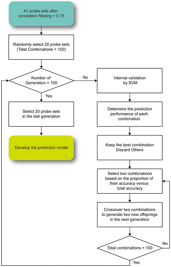 Figure 3: The proposed genetic algorithm for feature selection in the prediction model.To ensure that the prediction accuracy value of the model became stable, the selection was repeated for 100 generations.