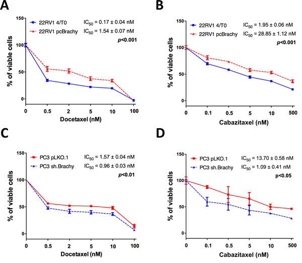 Figure 1: Brachyury promotes resistance to the cytotoxic drugs docetaxel and cabazitaxel. Brachyury overexpression increases significantly the IC50 of 22RV1 cells for both A. docetaxel and B. cabazitaxel. Brachyury depletion on PC3 cells decreases the IC50 for C. docetaxel and D. cabazitaxel. Data for drug assays are mean ± S.E.M, of 3 biological independent experiments with 3 technical replicates each.