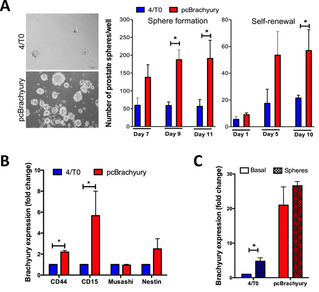Figure 2: Brachyury promotes stem cell properties in PCa cells and is re-expressed under pressure conditions. A. In 22RV1 cells Brachyury is able to enhance the capacity to form prostate-spheres and self-renewal over time, as well as B. increases the expression of stem cell markers CD44 and CD15. C. Brachyury is up-regulated in negative 22RV1 cells when cultured under stem cell medium. Results of prostate-sphere are representative of two biological independent experiments in duplicate. Graphs of expression are mean ± S.E.M of 3 biological independent experiments with 3 technical replicates each. *, p < 0.05.