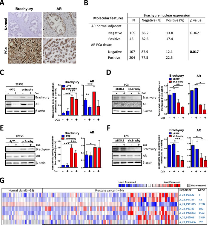 Figure 3: Brachyury is associated with AR, Bcl-2, ERG, CHGA and SYP expression and with loss of PTEN expression. A. Representative images of Brachyury and AR staining in normal and primary PCa tissues. B. Correlation of Brachyury and AR staining in prostate tissues. Nuclear Brachyury staining is correlated with AR only in primary PCa tissues. C.-F. Western blot analyses for Brachyury and AR expression in prostate cell lines treated with docetaxel (Doc) or with cabazitaxel (Cab). Graphs represent the densimetric semi-quantification of western blot images. G. Heatmap showing the co-expression of Brachyruy (T), AR, PTEN, Bcl-2, ERG, CHGA and SYP in normal and PCa human samples from Oncomine database.