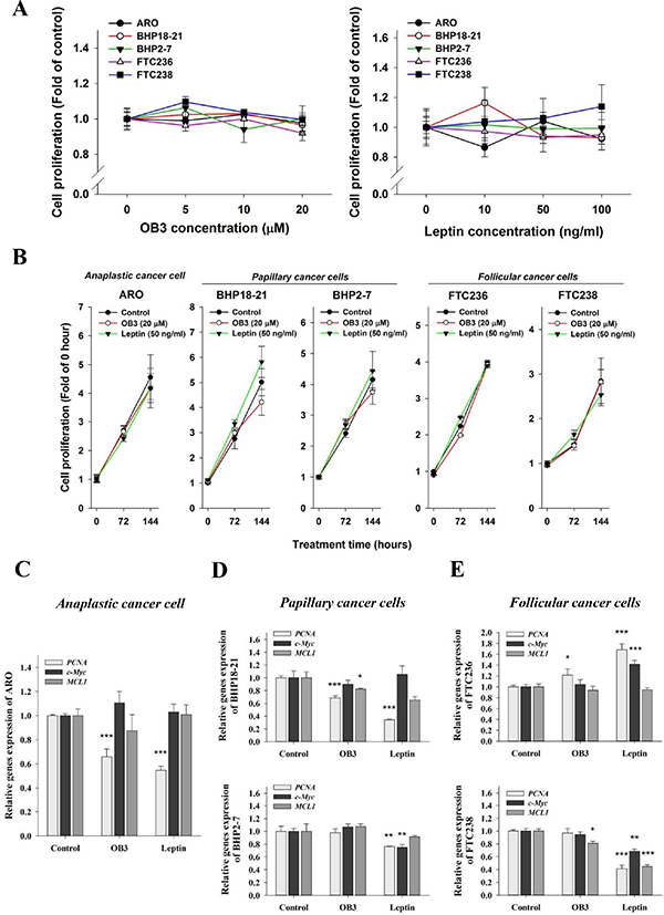 Figure 1: Effect of OB3 and leptin peptide on cell proliferation and proliferative gene expression in thyroid cancer cell lines. (A) Cells were seeded in 96-well plates and treated with different concentrations of OB3 peptide (left) or leptin peptide (right), and with re-freshed medium daily for 144 h. Cell proliferation was examined by MTT assay. (B) Cells were seeded in 96-well plates and treated with leptin peptide or OB3 with re-freshed medium daily for 144 h. Cell proliferation was examined on 72 h and 144 h by MTT assay. (C–E). Aliquots of cells of different thyroid cancer cell lines were treated with either leptin or OB3 for 24 h. Cells were harvested and total RNA was extracted. qPCR was conducted for PCNA, c-Myc and MCL1, as described in the Materials and Methods. (*p < 0.05, **p < 0.01, ***p < 0.001, were compared with control).