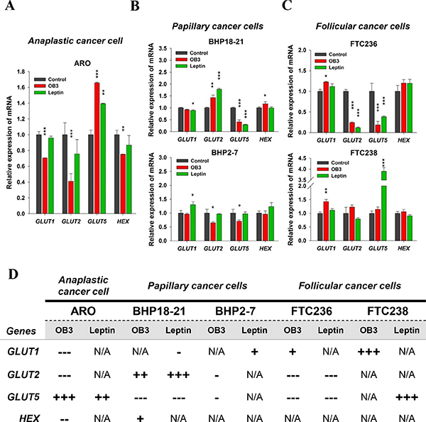 Figure 2: Effect of OB3 and leptin peptides on expression of genes relevant to metabolism in thyroid cancer cell lines. (A) Anaplastic, (B) papillary, and (C) follicular thyroid cancer cells were treated with either leptin or OB3 for 24 h. Cells were harvested and total RNA was extracted. qPCR for GLUT1, GLUT2, GLUT5, and HEX was conducted as described in the Materials and Methods. (D) According to statistical analysis of qPCR, the comparison of OB3 and leptin on metabolism genes in thyroid cancer cell lines was shown. (*p < 0.05, **p < 0.01, ***p < 0.001, were compared with control).
