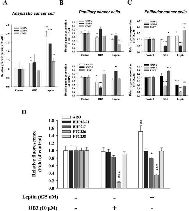 Figure 3: Effect of OB3 and leptin peptides on expression of genes relevant to invasion and cell invasion in thyroid cancer cell lines. (A) Anaplastic (B), papillary and (C) follicular thyroid cancer cells were treated with either leptin or OB3 for 24 h. Cells were harvested and total RNA was extracted. qPCR for MMP2, MMP9 and VEGF was conducted as described in the Materials and Methods. (D) Thyroid cancer cells (1 × 105/well) were starved in 0.1% serum-containing medium with 0.625 μM leptin or 10 μM OB3 at 37°C for 4 h and seeded onto the upper chamber of the transwell using the Millipore system for cell migration. After 6 h, the cells were subjected to chemoattraction and migrated to the lower chamber. Migration was quantified using the fluorimetric detection system (Millipore). (Data were expressed as mean ± S.D. in triplicate. *p < 0.05, **p < 0.01, ***p < 0.001, were compared with control).