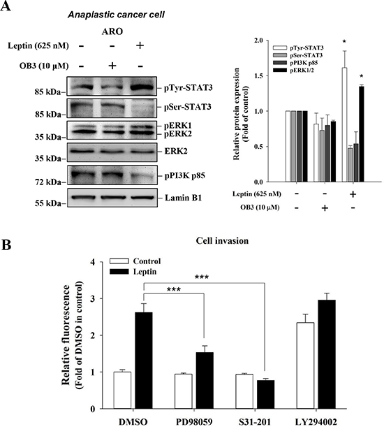 Figure 4: Signal transduction system activation is involved in leptin-induced invasion in anaplastic thyroid cancer cells. (A) Anaplastic thyroid cancer cells were incubated with 0.1 or 10 μM OB3, or leptin for 30 min. Nuclear extracts were prepared, proteins separated by PAGE, then immunoblotted with anti-phosphorylated MAPK (pERK1/2), anti-phospho-PI-3K p85, pSer-STAT3 antibody, and pTyr-STAT3 antibody. β-Actin was used as an internal loading control. Immunoblots were visualized by enhanced chemiluminescence (Amersham Life Science, Arlington Heights, IL, USA) and digital imaging. Results represent the mean ± SEM of three independent experiments. *p < 0.05 compared to untreated control. (B) Anaplastic thyroid cancer cells (1 × 105/well) were starved in 0.1% serum-containing medium with 0.625 μM leptin with or without PD98059 (10 μM), LY294002 or STAT3 inhibitor for one hr, and then incubated in the absence or presence of 10 μM leptin at 37°C for 4 h and seeded into the upper chamber of the transwell using the Millipore system for cell migration, respectively. After 6 h, the cells were subjected to chemoattraction and migrated into the lower chamber. A fluorimetric detection system (Millipore) quantitated movement. Data were expressed as mean ± S.D. in triplicate. (***p < 0.001, were compared with DMSO).