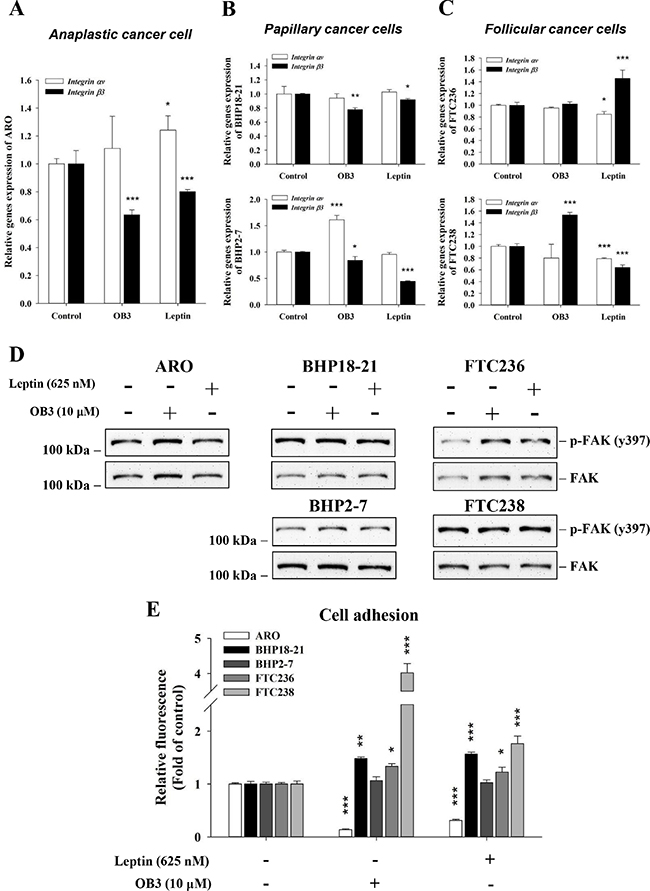 Figure 5: Effect of OB3 and leptin peptides on integrin αvβ3 gene expression, FAK activation and adhesion in thyroid cancer cell lines. (A) Anaplastic, (B) papillary and (C) follicular thyroid cancer cells were treated with either leptin or OB3 for 24 h. Cells were harvested and total RNA was extracted. qPCR for integrin αv and β3 was conducted as described in the Materials and Methods. (D) Different thyroid cancer cells were incubated with 10 μM OB3, or 0.625 μM leptin for 30 min. Total cell extracts were prepared, proteins separated by PAGE, then immunoblotted with anti-phosphorylated FAK or total FAK antibody. β-Actin was used as an internal loading control. Immunoblots were visualized by enhanced chemiluminescence (Amersham Life Science, Arlington Heights, IL, USA) and digital imaging. (E) Thyroid cancer cells (5 × 105/well) were starved in 0.1% serum-containing medium for 48 h. Cells were trypsinized and refed with medium with 0.625 μM leptin or 10 μM OB3 and cells were incubated at 37°C for 24 h. Cells were seeded into the 6-well cell culture plate for 6 h. The attachment cells were quantified using the fluorimetric detection system (Millipore). (Data were expressed as mean ± S.D. in triplicate. *p < 0.05, **p < 0.01, ***p < 0.001, were compared with control).