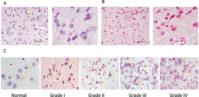 Figure 1: ISH analysis of miR-149 expression in normal brain tissue and in tissues of different grades of glioma carcinoma. (A) A representative example of a glioma tissue section showing cytoplasmic staining in the vast majority of tumor cells. The right image is the enlarged image of the red box part on the left. (B) The no-oligonucleotide detection probe staining (control for A). (C) Representative images of ISH staining of miR-149 in normal brain tissue, low-grade glioma carcinoma (grades I and II), and high-grade glioma carcinoma (grades III and IV). Expression of miR-149 is moderate (+) in all pictures. Pictures were taken at 200× magnification.