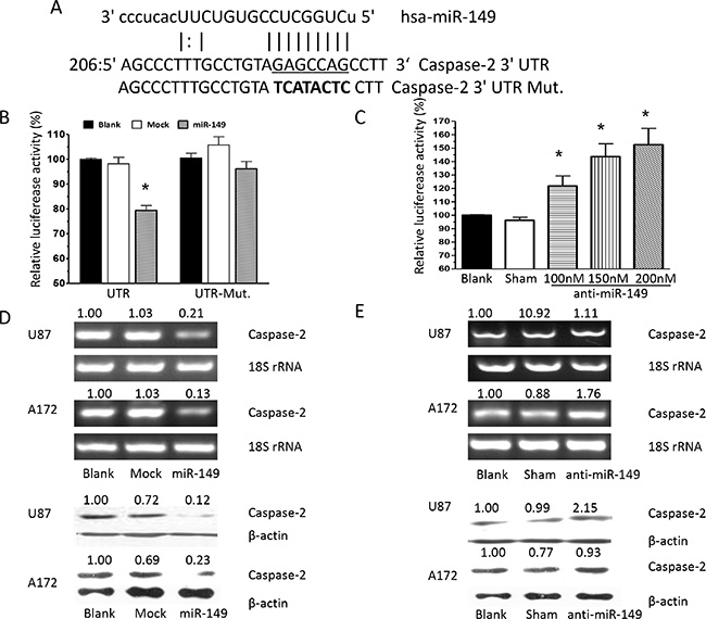 Figure 3: Caspase-2 is a functional target of miR-149 in U87-MG and A172 cells. (A) Alignment of potential miR-149-binding sites in the 3′UTR of the caspase-2 mRNA. Schematic shows the 3′UTR sequences of mature miR-149 and the seed mutant region. The seed 3′UTR sequence of mature miR-149 binding is underlined. (B) Luciferase activity assays showing decreased reporter activity after co-transfection of either wild type caspase-2–3′UTR or it’s mutated 3′UTR with miR-149 in U87-MG cells. (C) HEK293 cells co-transfected with caspase-2–3′UTR and anti-miR-149 showing increasing reporter activity that is concentration-dependent. (D) Western blot and RT-PCR analysis showing miR-149 suppression of caspase-2 expression in U87-MG and A172 cell lines. (E) Caspase-2 expression was enhanced after miR-149 inhibition in U87-MG and A172 cell lines. *p < 0.05; **p < 0.01.