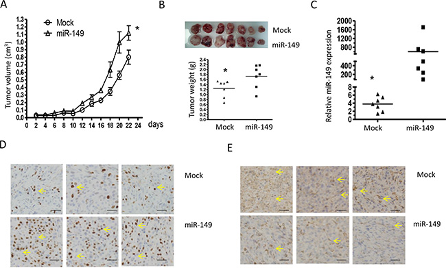 Figure 5: Elevated miR-149 expression in U87-MG cells promotes tumor growth and proliferation in vivo. (A) Growth curves of miR-149 stably expressed U87-MG tumors. The volume of the tumors was measured every two days and each data point represents the mean ± SD in 7 mice. (B) Primary tumors removed from the mice and tumor weights showing the promotion of miR-149 in cell growth. (C) Quantitative miR-149 expressions in xenografts. (D) Immunohistochemistry in sections derived from U87-MG tumors. Sections were incubated with Ki67 antibody and caspase-2 antibody for detection of cell proliferation and caspase-2 expression, respectively. Yellow arrow indicates typical staining. (E) Sections derived from tumors with anti-antibodies for p53 and p 21. Representative fields are shown. *p < 0.05; **p < 0.01.