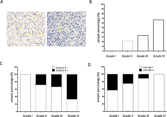 Figure 6: Caspase-2 expression is correlated with tumor grade in glioma. (A) Representative images of immunohistochemical staining of caspase-2 proteins in glioma tissue sections (200 ×). Yellow arrow indicates typical staining. (B) Percentage of caspase-2 positive expression in low-grade (grades I and II) and high-grade (grades III and IV) glioma carcinoma specimens as analyzed by immunohistochemistry on a human glioma tissue microarray (N = 72). (C) Percentage of caspase-2 positive (+) expression in miR-149 positive glioma carcinoma subgroups (N = 57). (D) Immunohistochemistry showing percentage of moderate miR-149 expression (+) and strong miR-149 expression (++) in low-grade (grades I and II) and high-grade (grades III and IV) glioma carcinoma subgroups (N = 57). **p < 0.01.