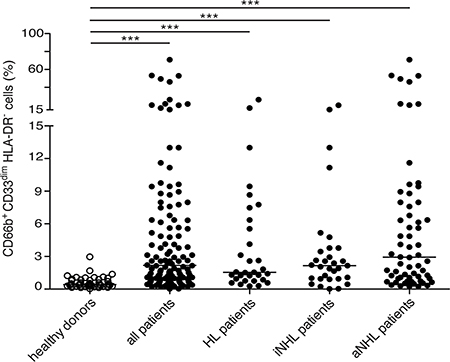 The percentage of CD66b+CD33dimHLA-DR– cells is increased in PBMCs from lymphoma patients as compared to healthy donors