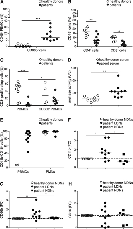 Figure 4: (A, B) Median percentage of CD66b+ cells within CD45+ PBMCs (A) or CD4+ and CD8+ cells within total CD45+ cells (B) of healthy donors (n = 9 and 6, respectively) and lymphoma patients (n = 10). (C) Median percentage of proliferating CD3+ T cells in CD3/CD28-stimulated PBMCs (total or CD66b+ cell depleted) from healthy donors (n = 9 and 4, respectively) and lymphoma patients (n = 10 and 7, respectively), as revealed by CFSE dilution measured by flow cytometry. (D) Median arginase activity measured in serum from healthy donors (n = 9) and lymphoma patients (n = 10). (E) Median percentage of CD11b+CD16+ LDNs with respect to CD66b+CD33dimHLA-DR- cells in the mononuclear fraction (PBMCs), and median percentage of CD11b+CD16+ NDNs in the polymorphonuclear fraction (PMNs) of healthy donors (n = 9 and 9, respectively) and lymphoma patients (n = 10 and n = 5, respectively). (F–H) Expression of CD11b, CD66b and CD16 on NDNs from healthy donors (n = 9) and LDNs or NDNs from lymphoma patients (n = 10 and 5, respectively). Data are expressed as median fold change (FC) of the median fluorescence intensity (MFI) of each antigen on patient LDNs or NDNs over NDNs from healthy donors. * = p ≤ 0.05; ** = p ≤ 0.01; *** = p ≤ 0.001. nd: not done.