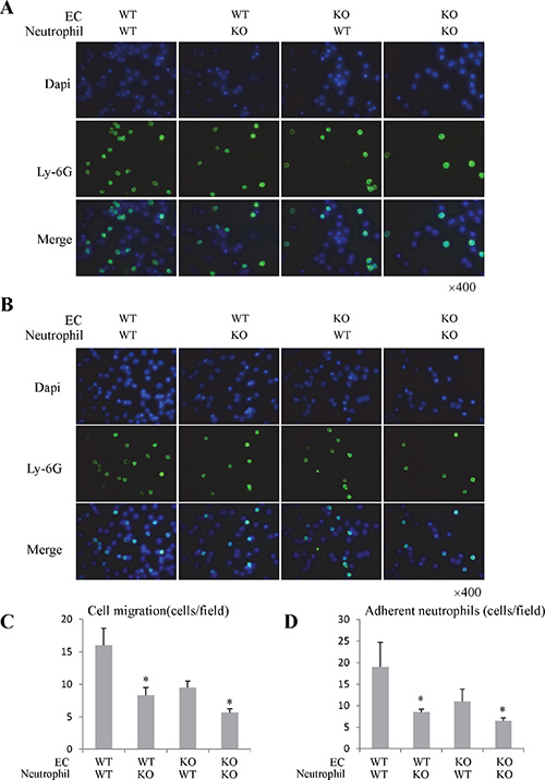 Figure 4: The knockout of Rap1 attenuated the neutrophils migration and adhesion activity in vitro study. (A) The migration activity of neutrophils in response to LSECs was analyzed by neutrophils migration assay. (B) The neutrophils and LSECs adhesion was investigated through co-culture system. (C) The quantitative analysis of migrated neutrophils in response to LSECs. (D) The quantitative analysis of adherent neutrophils. (*Compared to wild type group P < 0.05).